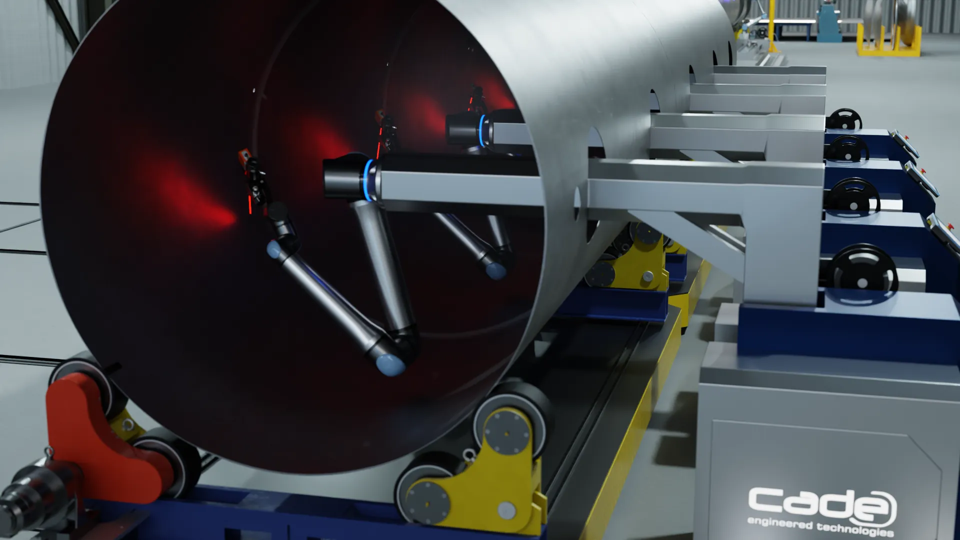 Para el cierre del conjunto, se incorpora una estación de centrado y soldadura circunferencial robotizada, orientada a asegurar uniformidad de junta y estabilidad de cordón. Finalmente, una estación de soldadura interna robotizada sistematiza las uniones dentro del casco, reduciendo la dependencia de trabajos manuales lentos y exigentes, y elevando la consistencia del resultado.